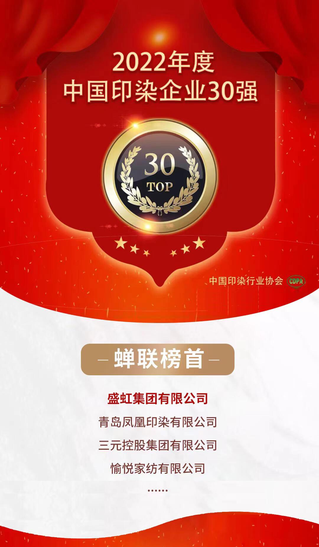 “2022年度中国印染企业30强”榜单是综合考评企业规模、经济效益、社会责任、创新能力以及节能环保等情况评比得出,目的是引导我国印染行业企业加快改革创新和转型升级步伐,提高国际竞争力,实现高质量发展。